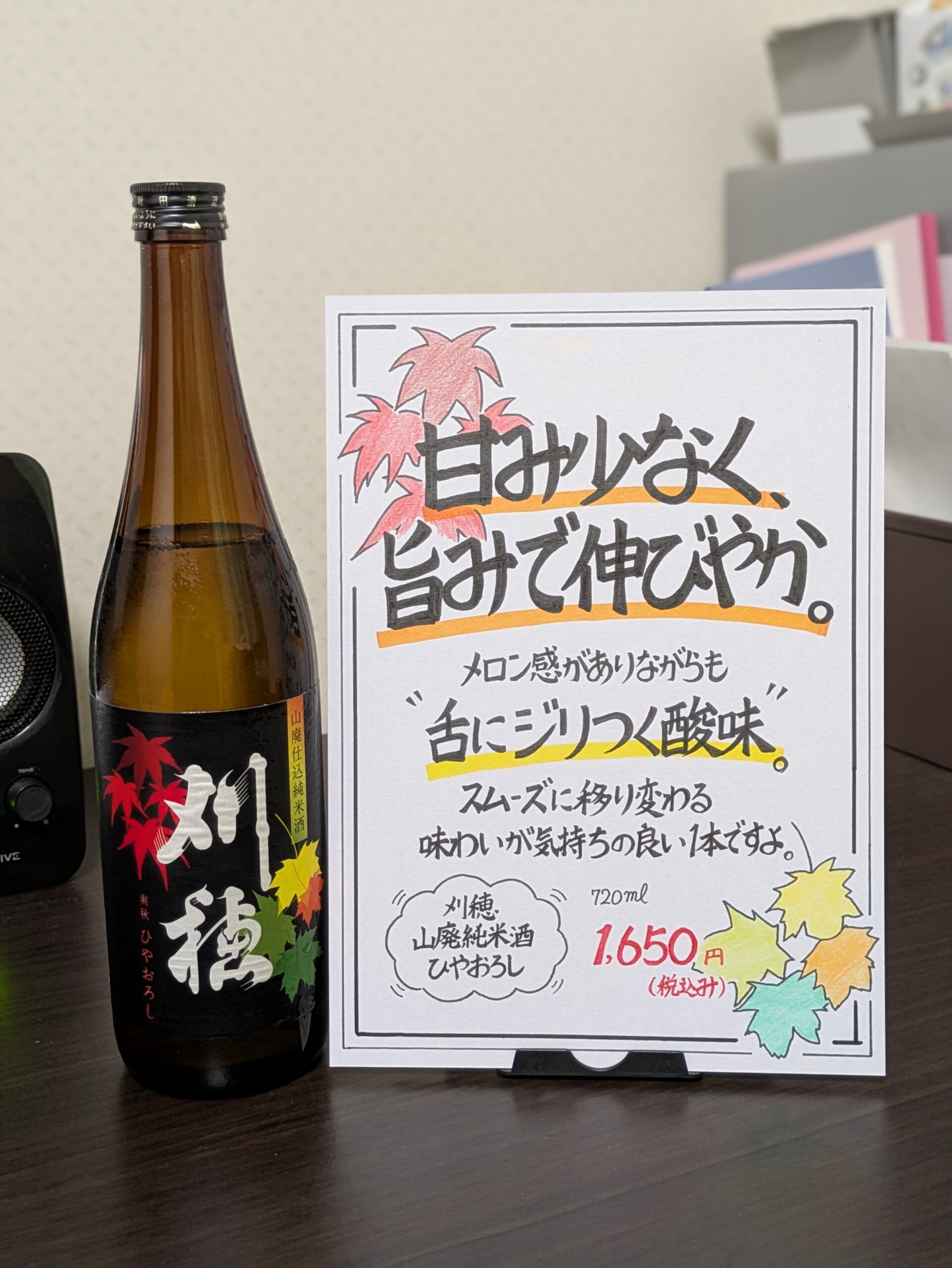 グッと入る『山廃』らしさの後に、スッと喉をとおる『刈穂』らしさがありますよ。